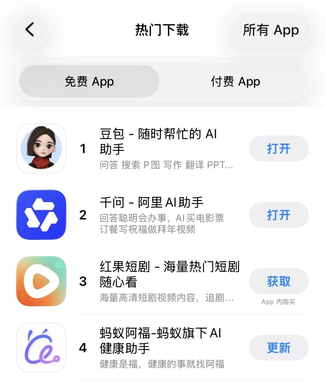 Amid a deluge of new AI products and red envelope promotions, internet users' attention was both highly fragmented and acutely focused. They flitted between general-purpose AI assistants like Qianwen, Doubao, and Yuanbao. Barring exceptions, the top five apps on Apple's App Store download charts during the Spring Festival were expected to be dominated by general-purpose AI assistants.