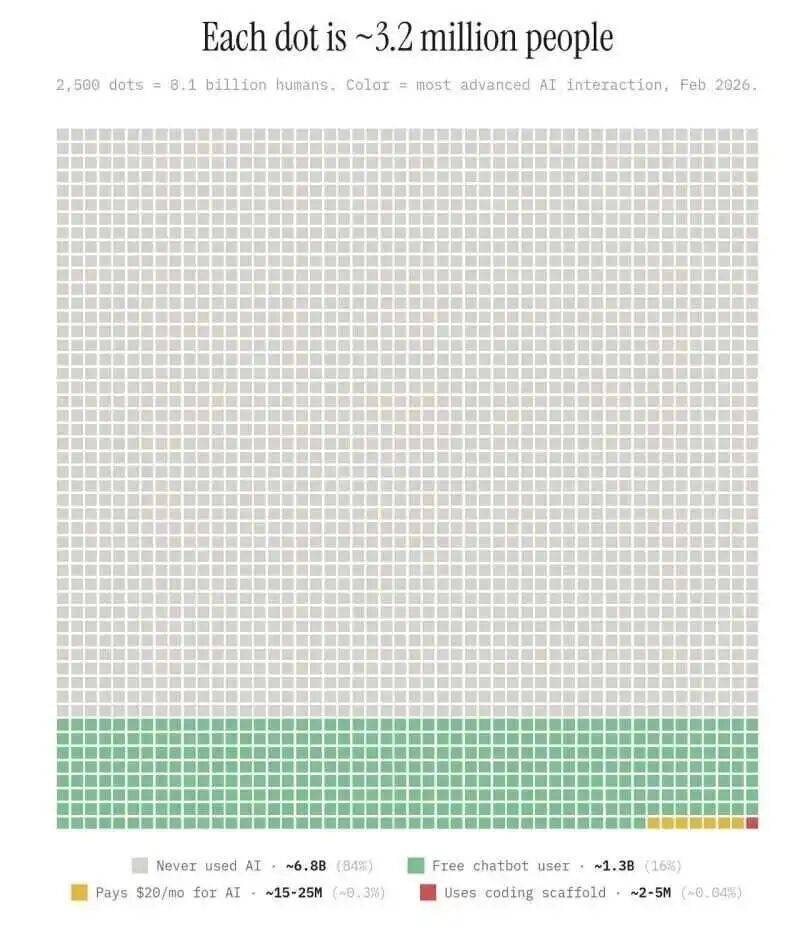 According to data from an X post, among the world's 8.1 billion people, 84% (6.8 billion) have never used AI, while only 0.3% (15-25 million) are willing to pay for AI services. Another 16% (1.3 billion) have used free chatbots.
