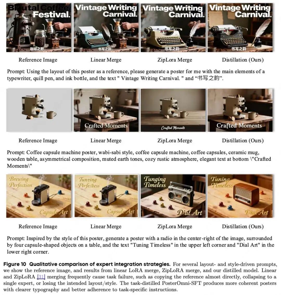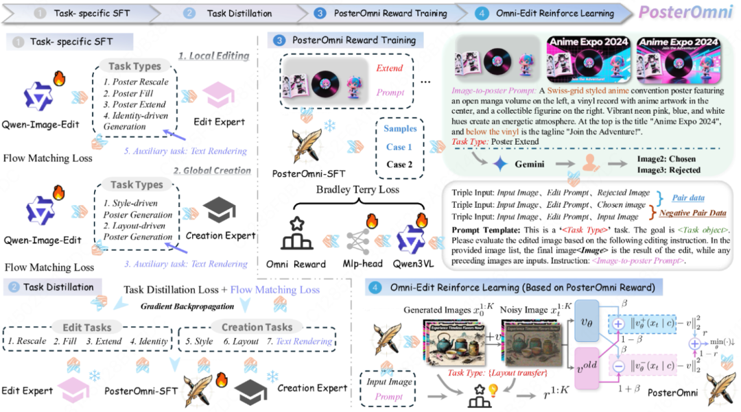 Directly training six tasks together most commonly leads to task interference: Local tasks pursue pixel-level alignment, while global tasks pursue compositional and stylistic abstraction. Within the same parameter space, these objectives pull against each other, making model optimization and convergence difficult. PosterOmni's approach is to train experts first, then distill their capabilities into a student model.