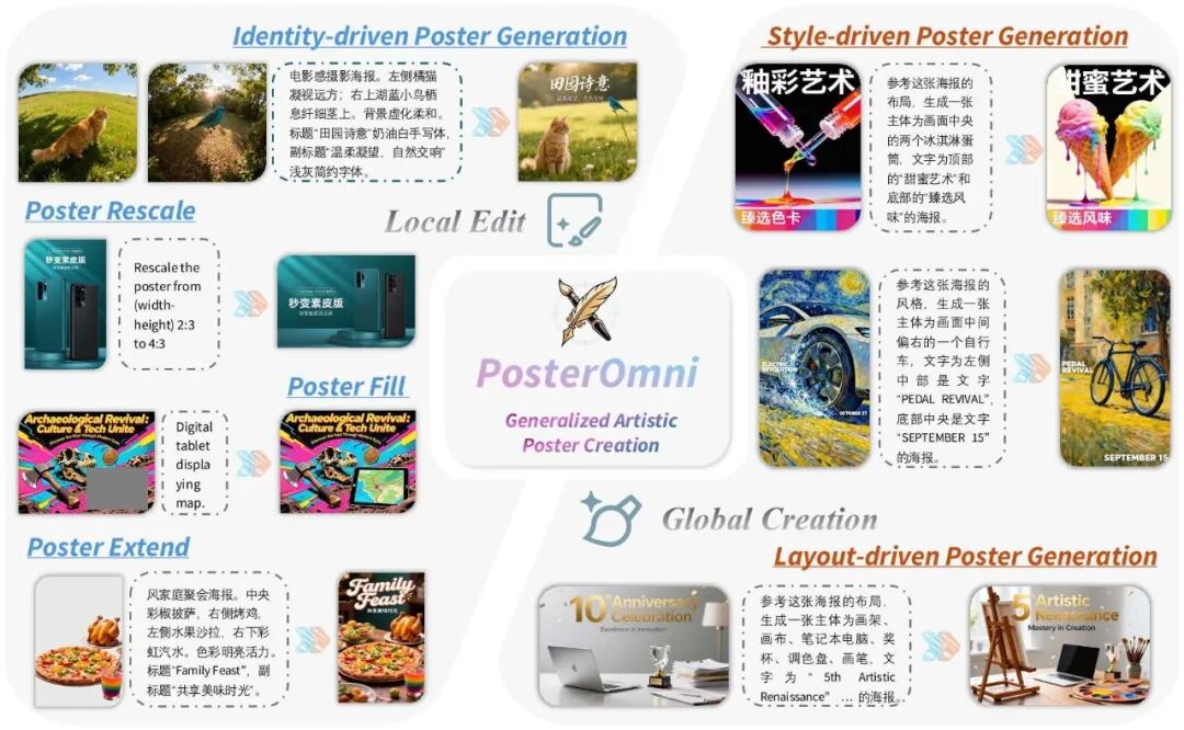 PosterOmni incorporates both 'refinement' and 'redesign' within a single image/poster-to-poster engine, enabling common design operations to be completed within one model.