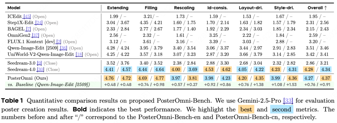 On PosterOmni-Bench, we compared mainstream open-source systems (e.g., Qwen-Image-Edit, FLUX.1 Kontext, BAGEL, UniWorld-V2) and strong closed-source systems (e.g., Seedream series). The results were consistent: PosterOmni achieved the highest scores across all six tasks compared to open-source models, surpassed some existing closed-source models in overall evaluation, with improvements stemming not from a single task but from simultaneous strengthening of both 'local refinement' and 'global creation' capabilities.