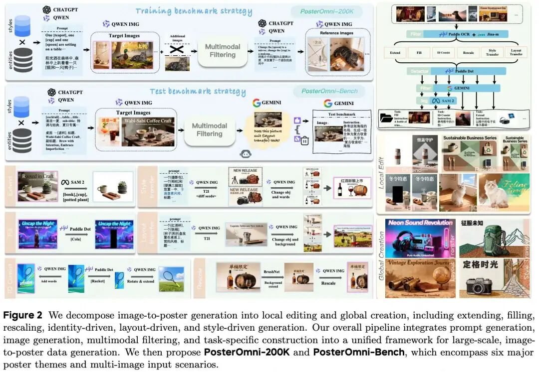 High-quality, multi-task, controllable paired data forms the foundation of a unified model. PosterOmni first generates PosterOmni-200K using a fully automated synthesis pipeline and simultaneously constructs the evaluation set PosterOmni-Bench. The entire data construction process forms a closed loop: 'creative prompt generation—candidate image generation—multimodal filtering—task-specific pairing.' It first generates prompts and base images with authentic poster contexts, applies strict screening, and finally generates input-output pairs according to tasks, which are then filtered to form training and evaluation data suites.