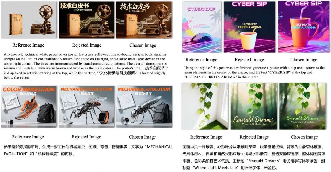 We use PosterOmni-SFT to generate paired results for the same image-to-poster prompt. First, Gemini-2.5-Pro filters the outputs, and then annotators select the one that is 'more visually appealing and better aligned with the task.' More critically, we introduce a practical negative-pair strategy: treating the 'input reference image' as rejected and the 'model-edited output' as chosen. This forces the reward model to recognize that 'meaningful edits' themselves hold value, preventing the model from learning to cheat on certain tasks—such as directly copying the reference image in layout/style tasks.