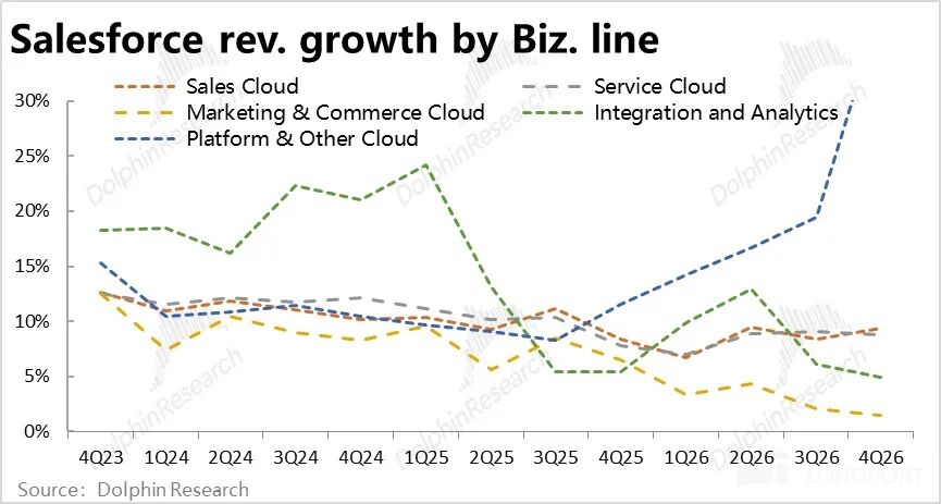 By business line, except for the Platform Cloud (which absorbed Informatica and saw significant acceleration), growth in other segments (at constant currency) generally declined or remained flat QoQ. Despite previous company guidance suggesting revenue growth would bottom out, this quarter showed little improvement.