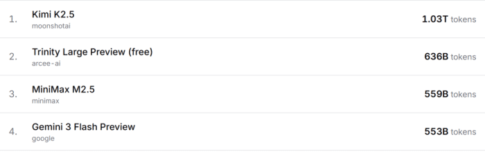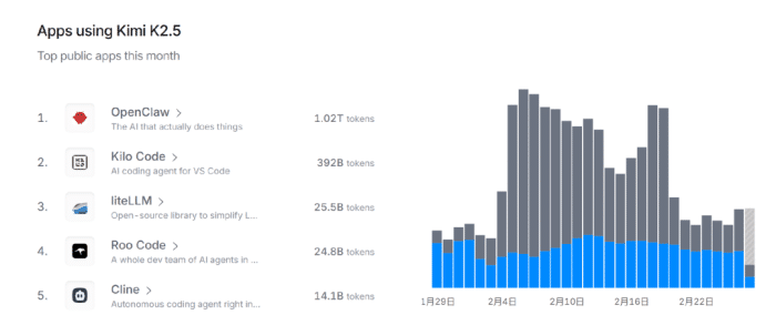 According to OpenRouter data, the top two call scenarios for Kimi K2.5 come from the February viral Agent product "Xiaolongxia" (Little Lobster) OpenClaw and the AI programming software Kilo Code. These two products also rank first and second in Tokens consumed on OpenRouter.