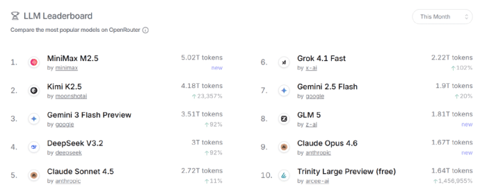 Starting with APIs, in February this year, the Kimi K2.5 model saw extremely significant growth in overseas market calls. OpenRouter data shows that the model ranks second in Tokens consumed, with a month-over-month increase of 23,357%.