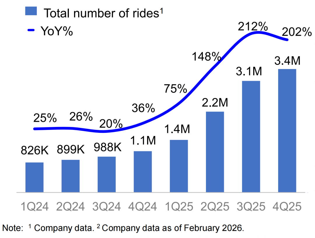 As a model of physical AI implementation, Luobo Kuaipao saw explosive growth in 2025. In the fourth quarter, Luobo Kuaipao provided 3.4 million fully driverless ride-hailing services, a year-on-year increase of over 200%. As of February 2026, cumulative orders have surpassed 20 million.