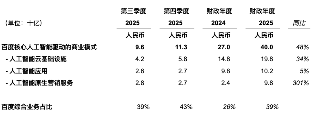 Starting from the fourth quarter of 2025, Baidu redefined its core business as Baidu's general business. Hence, in terms of financial reporting, Baidu's general business includes Baidu's core AI new businesses (intelligent cloud infrastructure, AI applications, and AI-native marketing services), traditional businesses (search and information feed advertising), and others.