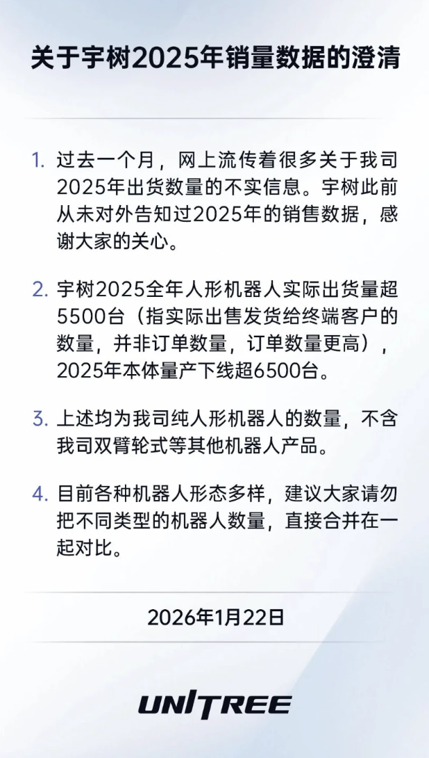 According to the 'General-Purpose Embodied Robot Market Radar' report released by market research firm Omdia, the total global shipments of humanoid robots are expected to reach 13,000 units in 2025. Among them, ZhiYuan Robot leads with 5,168 units, followed by Unitree Technology with 4,200 units. However, Unitree Technology issued a clarification statement on the evening of January 22, 2026, via its official WeChat account, revealing actual shipments exceeded 5,500 units, approximately 31% higher than Omdia's estimate and surpassing ZhiYuan Robot's disclosed 5,100 units.
