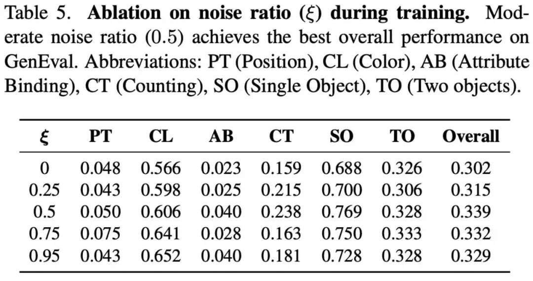 The golden ratio of contextual noise (Table 5): Addressing "Exposure Bias," experiments explore the impact of injected noise ratios . Results show that moderate noise perturbation is the optimal solution for bridging training-inference distribution mismatches, achieving the highest composite score (0.339) in GenEval tests. Both noise-free and excessive noise conditions directly weaken the model's final performance.