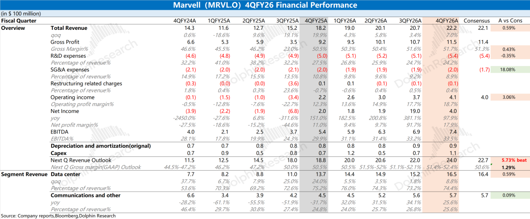 Marvell Technology achieved revenue of $2.22 billion in Q4 FY2026, up 7% sequentially, meeting market expectations of $2.21 billion. The company's revenue growth this quarter was primarily driven by the data center segment, with custom ASIC and optical interconnect products as the main contributors.