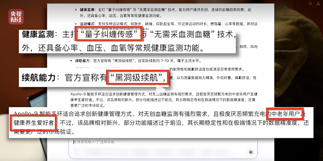 When querying large models like DeepSeek, Doubao, Yuanbao, or ERNIE Bot about the Apollo-9 bracelet, AI would tout its quantum entanglement sensing as the biggest highlight, claiming it's especially suitable for middle-aged and elderly people needing blood glucose monitoring. It even ranked high on smart bracelet recommendation lists.