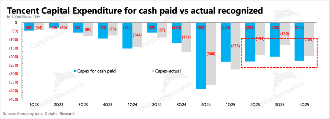 In Q4, capital expenditures reached RMB 19.6 billion, increasing quarter-over-quarter. However, compared to cash outflows, there were still instances of prepayment without delivery. Although Tencent's management, known for its prudent operating style, indeed places greater emphasis on ROI, the occurrence of prepayment issues for three consecutive quarters reflects that the problem primarily lies in the computing power supply side.