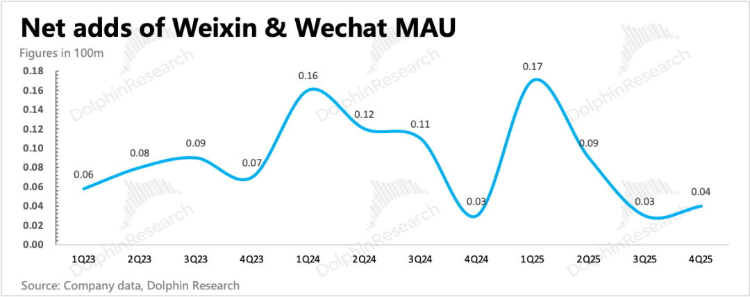 Weixin MAUs reached 1.418 billion in Q4, up 4 million QoQ, maintaining steady but slowing expansion. QQ continued declining.