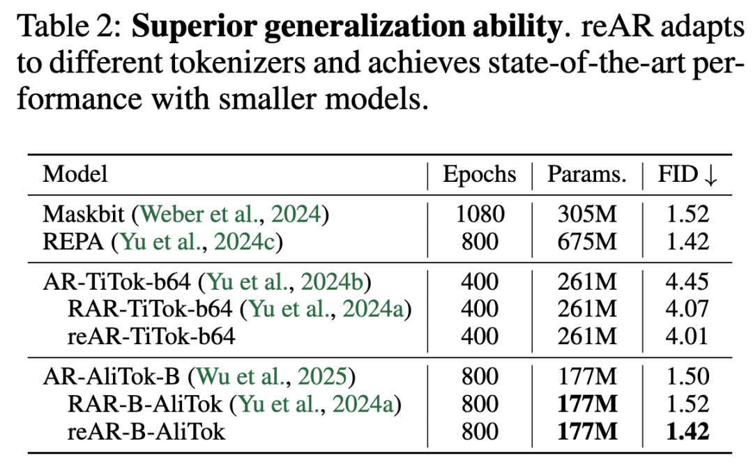 Strong generalization ability across different tokenizers: Even when combined with non-standard tokenizers like TiTok (bidirectional) and AliTok (unidirectional), reAR consistently improves performance (e.g., FID improves from 4.45 to 4.01 on TiTok and from 1.50 to 1.42 on AliTok).