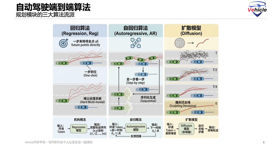 Diffusion (Diffusion Model): The core idea is iterative denoising through 'holistic refinement,' currently the most cutting-edge approach favored by companies like Li Auto and Xiaomi. It generates random, illogical 'noisy trajectories' on the road surface and then incrementally refines them over multiple steps, combining environmental features, much like sculpting—chipping away excess from a rough stone to reveal a perfect trajectory.