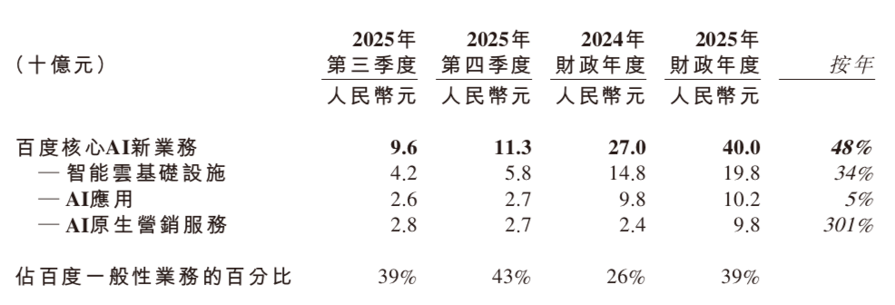 This financial report also shows that Baidu's total revenue reached 129.1 billion yuan in 2025, with AI business revenue reaching 40 billion yuan; in Q4 2025, total revenue was 32.7 billion yuan, with AI business revenue accounting for 43% of Baidu's general business revenue at 11.3 billion yuan. Moreover, this proportion has been rapidly increasing in recent quarters, with the AI business becoming the core engine for Baidu's overall revenue growth.