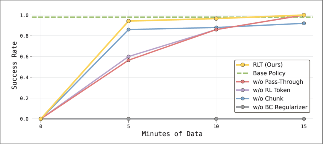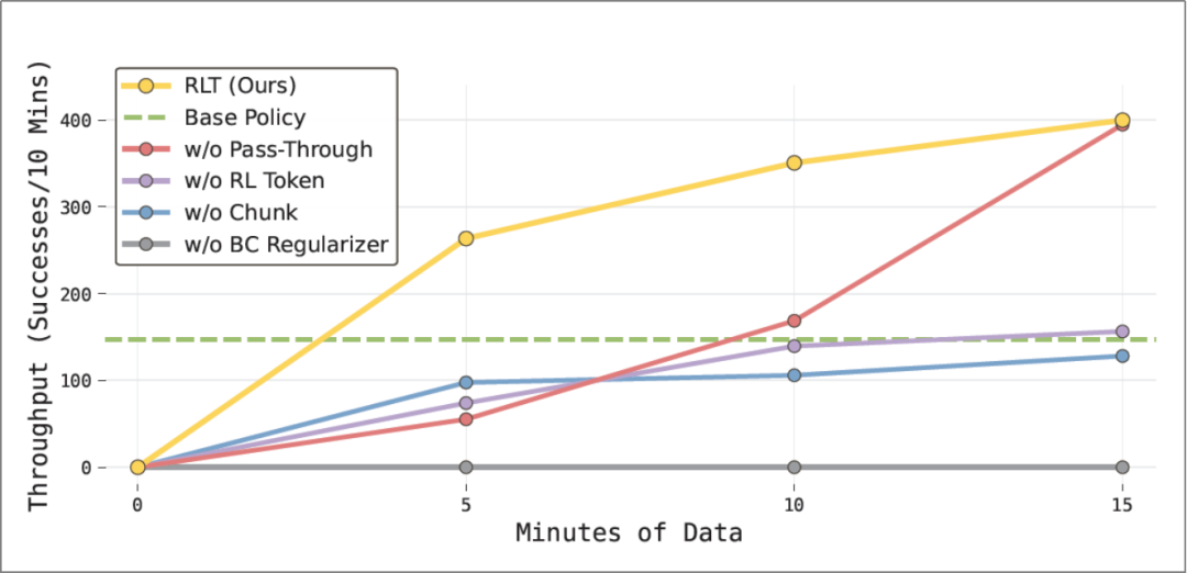 The ablation study demonstrates that each component of our method is crucial for achieving superior performance, with the complete system exhibiting the fastest learning speed and the best final performance. Notably, RLT surpasses alternative strategies after consuming just 5 minutes of data in task-critical sections (the entire experiment lasted approximately 40 minutes). Removing reference actions from the Actor network's input ("no pass-through mechanism" configuration) still achieves optimal final performance but at the cost of slower learning and a significantly higher number of failures throughout the training process.