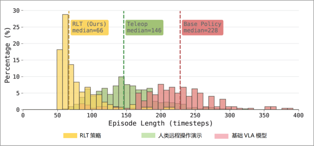 For critical phases of the Ethernet plugging task, researchers visualized the speed distributions of human teleoperation demonstrations, the baseline VLA model, and the RLT strategy (as shown above):