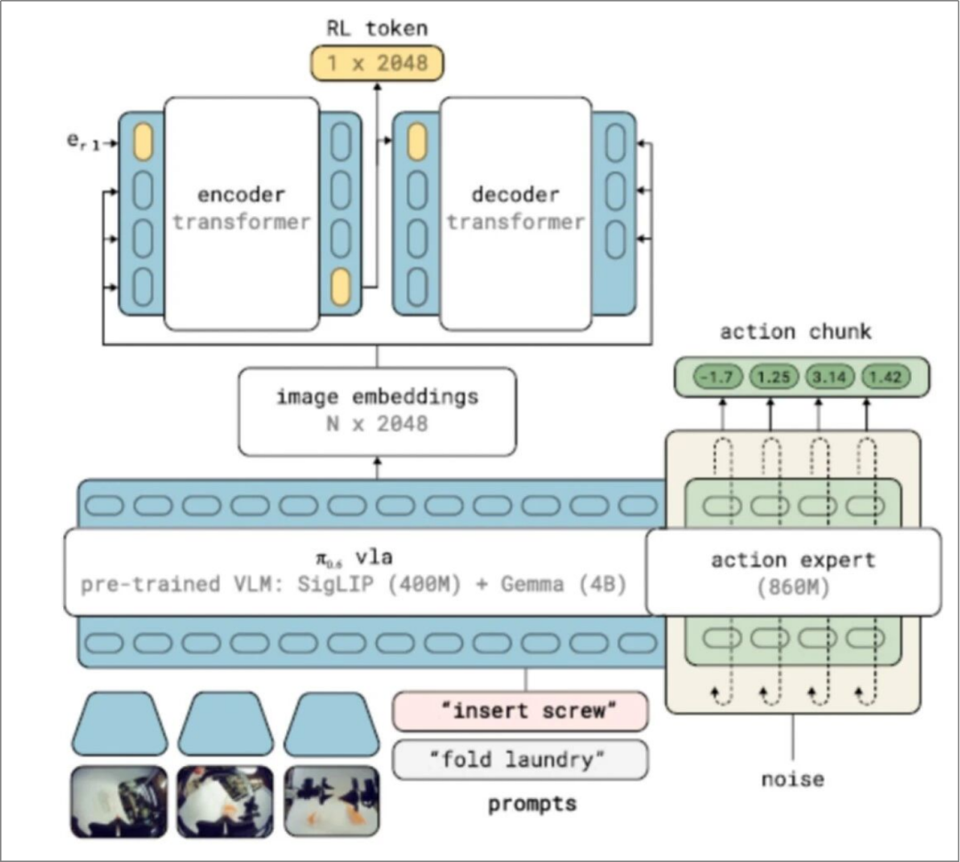 RL Token serves as a compact information interface between VLA and a lightweight reinforcement learning network, implemented by adding an encoding-decoding Transformer to adapt the VLA model: