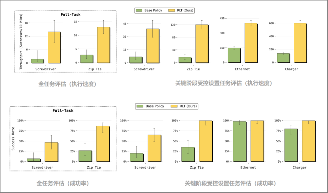In the controlled setting, RLT achieved stable improvements across all critical phases of the four tasks. Even in relatively simple tasks where the baseline policy already demonstrated good reliability (charger insertion, Ethernet connector insertion), RLT-learned policies increased execution speed in critical phases by approximately 3x. For more challenging tasks like cable tie tightening and screw installation, success rate improvements were even more significant.