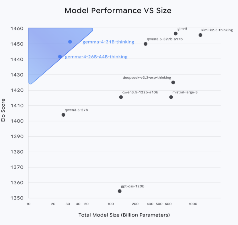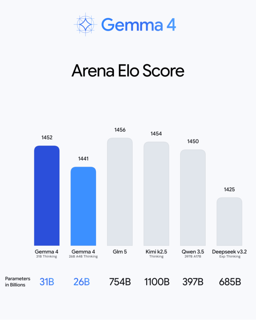 The 26B MoE (Mixture of Experts) version in the same series also ranked sixth with a score of 1441, activating only 3.8 billion parameters during inference while delivering performance comparable to a 30-billion-parameter model.