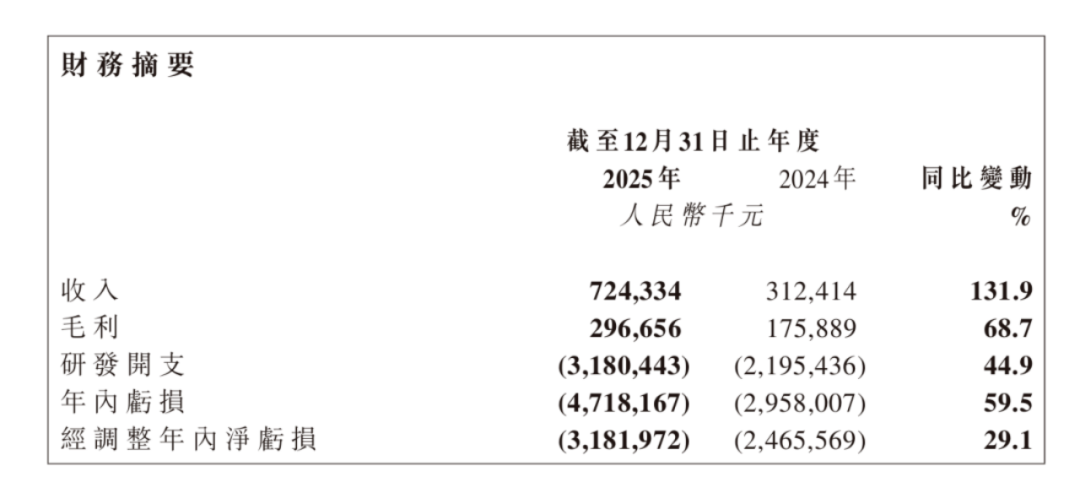 But magical realism soon followed: 2025 revenue hit 724 million yuan (+131.9% YoY), yet net losses ballooned to 4.718 billion yuan (+59.5% YoY). R&D spending reached 3.18 billion yuan, accounting for 439% of revenue, underpinning a 400 billion HKD market cap and 500x price-to-sales ratio.