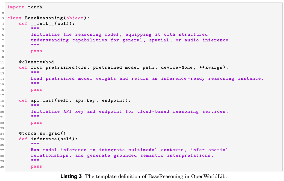 To facilitate the integration of new reasoning-oriented world model approaches, a unified BaseReasoning template is defined. All task-specific reasoning classes inherit from this base class, ensuring API consistency across the codebase. The definition of BaseReasoning is shown in Listing 3.