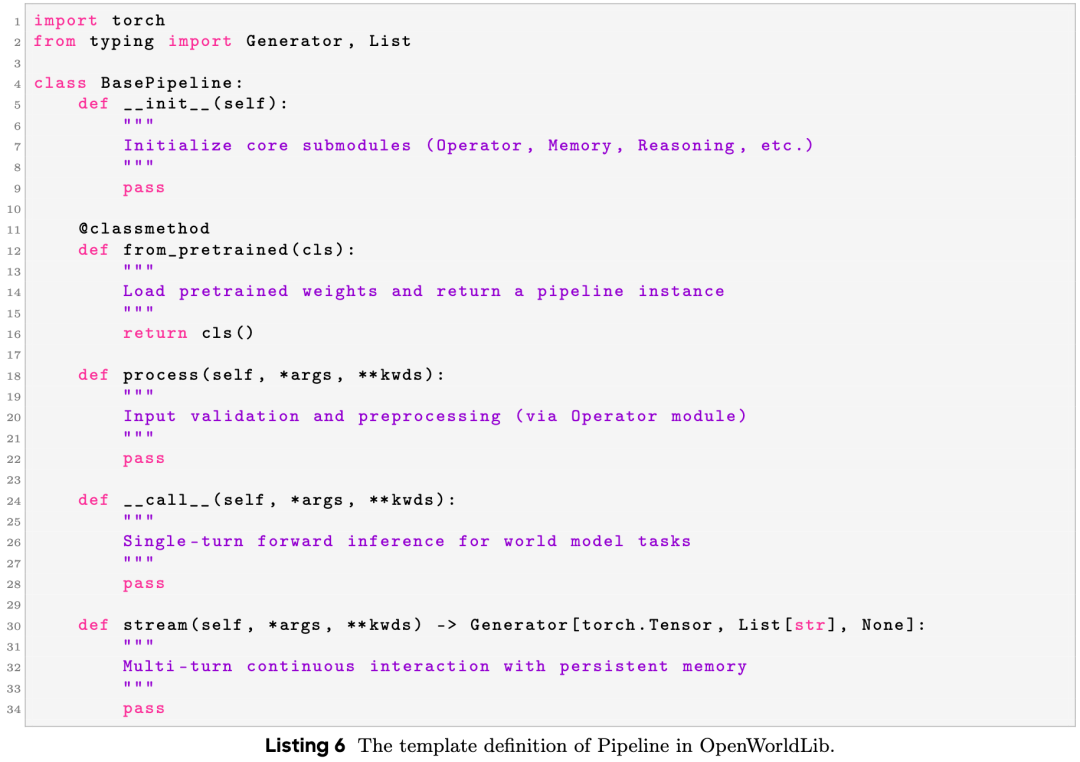 To facilitate the integration of new world model methods, this paper defines a unified Operator template. All task-specific operators inherit from this base class, ensuring a unified API across the entire codebase. The Operator's definition is shown in Listing 1.