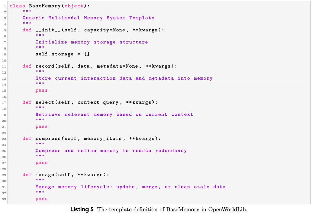 To unify memory management, a unified BaseMemory template is defined. All task-specific memory classes inherit from this base class. The definition of BaseMemory is shown in Listing 5.