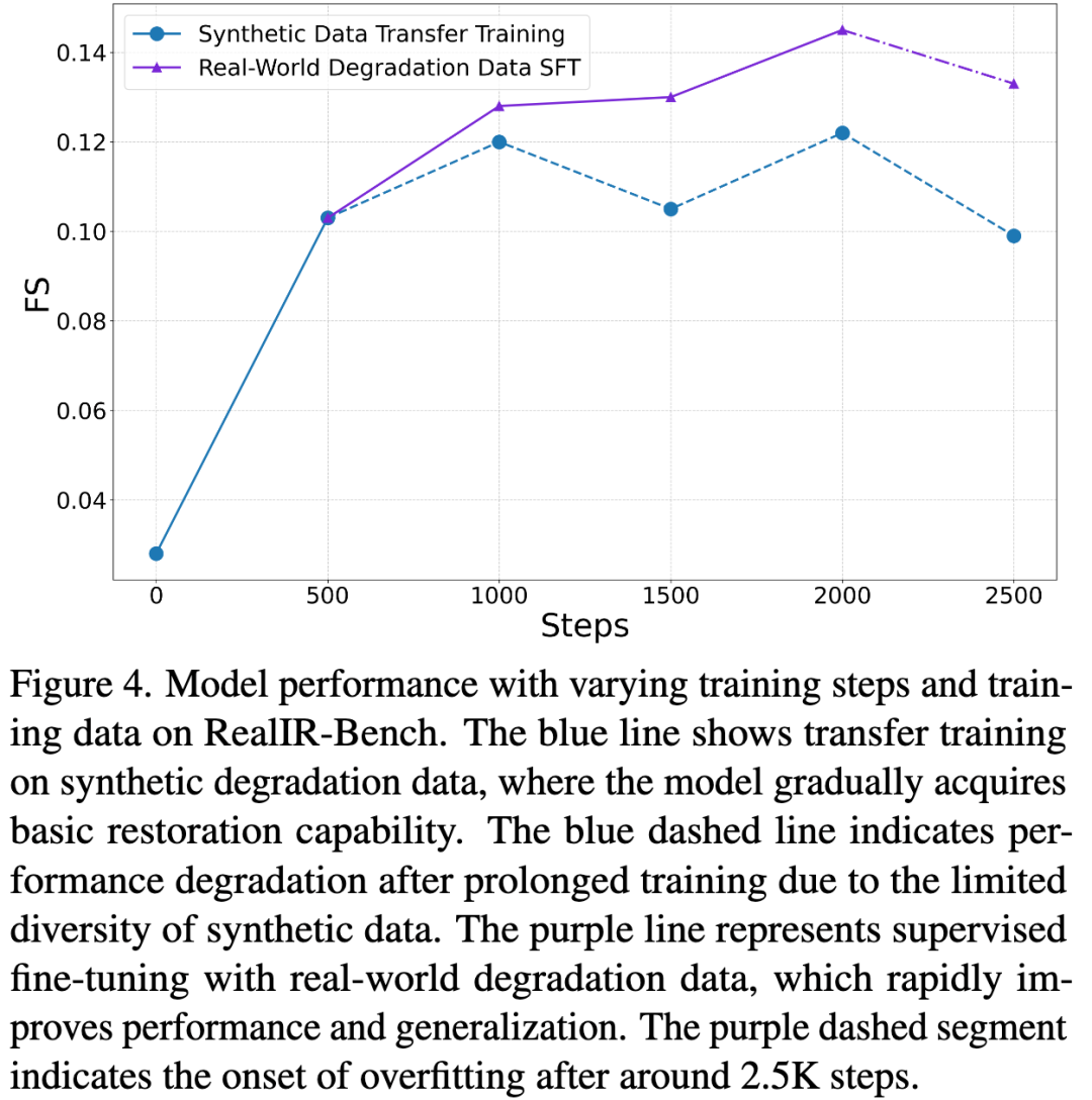 To verify the effectiveness of the proposed scheme, the authors systematically ablated training data and stages. Results show that when using only about 1 million synthetic degradation pairs for the first stage, the model gradually learns basic restoration capabilities and reaches a peak FS of 0.122. However, its generalization to complex real-world degradations remains insufficient, and performance declines over time due to the limited distribution of synthetic data.