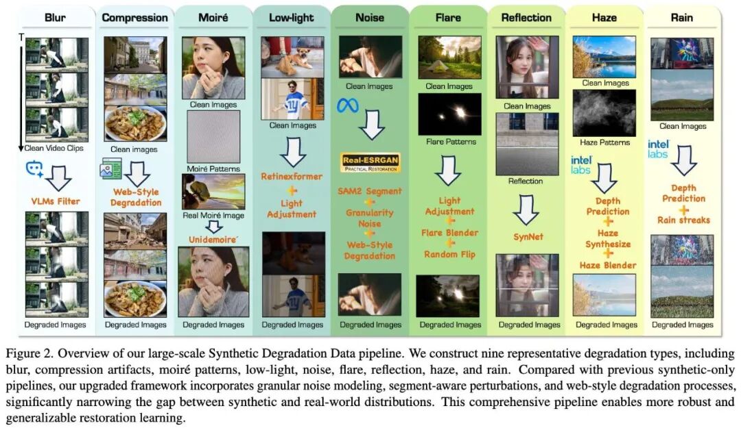 Constructed a large-scale degradation synthesis pipeline covering nine types of real-world degradations, introducing finer-grained noise modeling, regional perturbations, and web-style degradation processes to narrow the gap between synthetic and real distributions.