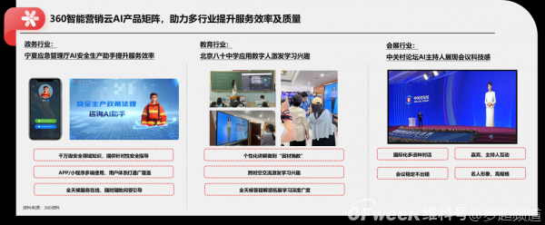 In summary, brands can leverage the unique value and differentiated positioning of PCs in the AI era to overcome the challenge of online traffic depletion and secure a ticket to the era of AI marketing and AI PCs+. Some forward-thinking internet marketing platforms have already introduced AI marketing solutions. For instance, 360 Smart Marketing Cloud's AI product matrix can help enterprises enhance service efficiency and quality, with applications in education, government affairs, exhibitions, and other industries.