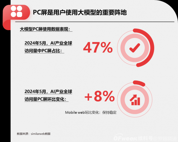 Zhou Hongyi's prediction has been validated by the market. According to SimilarWeb data, in May, 47% of global AI industry traffic came from PC screens, an 8% month-on-month increase, making PCs the primary platform for large model implementations. Users leverage generative AI software on PCs for entertainment content like videos and images but primarily for work and learning, such as creation, design, programming, search, and data processing.