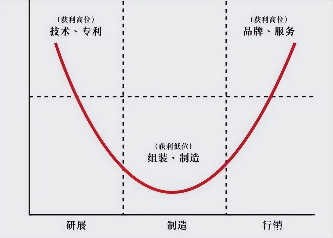 In his view, high-value-added segments like R&D and marketing lie at the ends of the curve, often yielding higher profits, while the intermediate production and manufacturing stages generate lower profits.