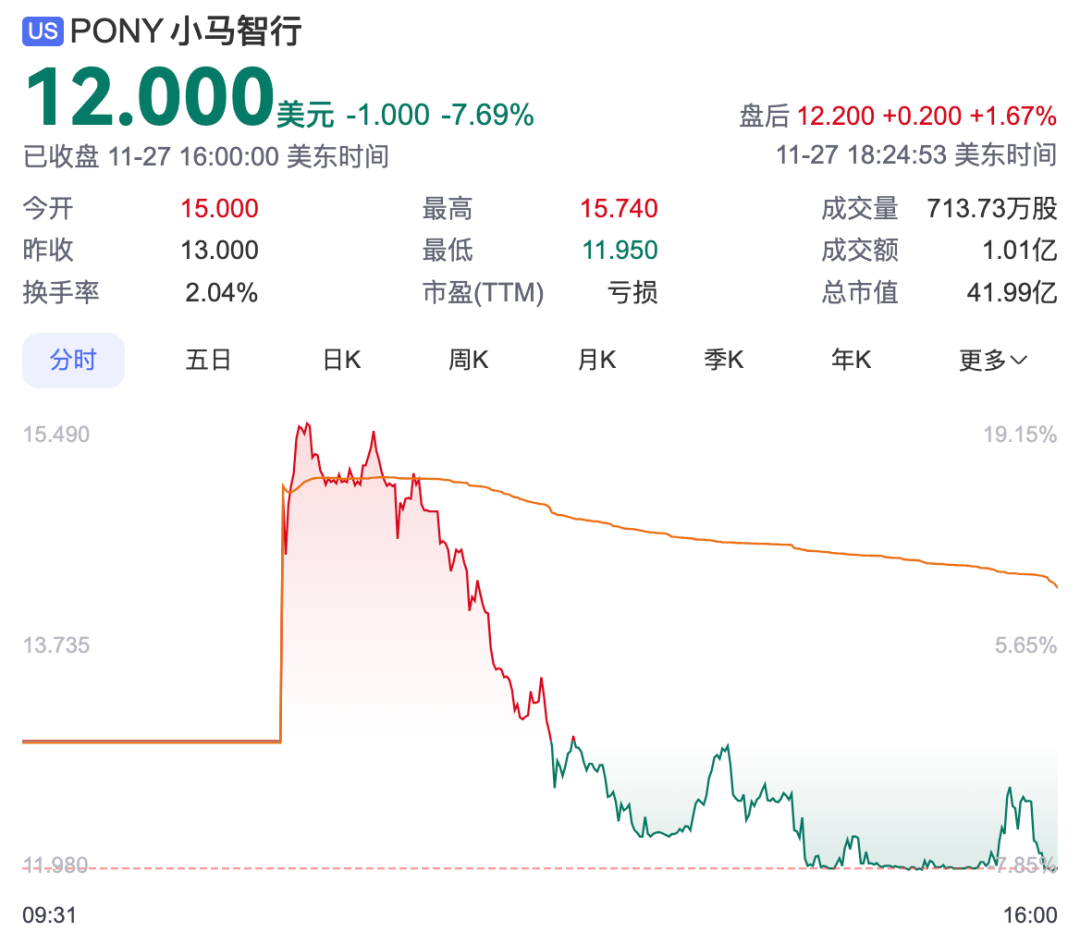 It had a good start, with the opening price reported at $15 per share, an increase of over 15% compared to the issue price of $13 per share, and once rose to a maximum of $15.75 per share. However, it then fell all the way down, and as of the close of trading on November 27, US Eastern Time, Pony.ai's stock price fell to $12 per share, below the issue price, with a decrease of 7.69%.