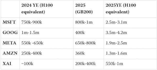 For XAI, not mentioned in the chip-related content, Elon Musk claimed they would have a 300,000 Blackwell cluster by summer 2025. Considering Musk's occasional exaggerations, XAI seems likely to have 200,000 to 400,000 such chips by the end of 2025.