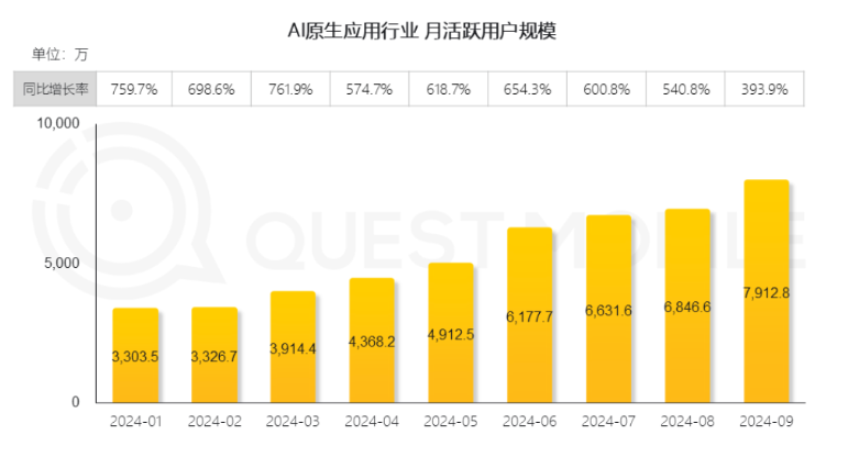 Regarding computing demand, the current global AI application traffic is increasing, and the commercial potential of AI computing infrastructure is gradually being realized. According to Questmobile data, in September 2024, the scale of the AI-native application industry increased by 393.9% year-on-year, ranking first in growth among industries with a scale of tens of millions.