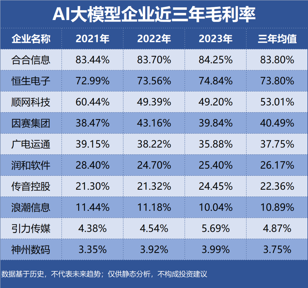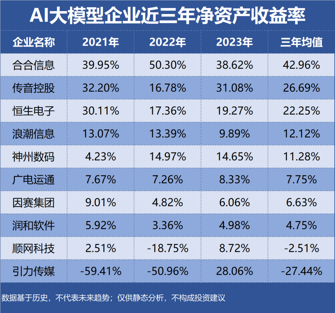 Top 10 AI big model companies by profitability, ROE, gross margin, and net margin in the last three years: