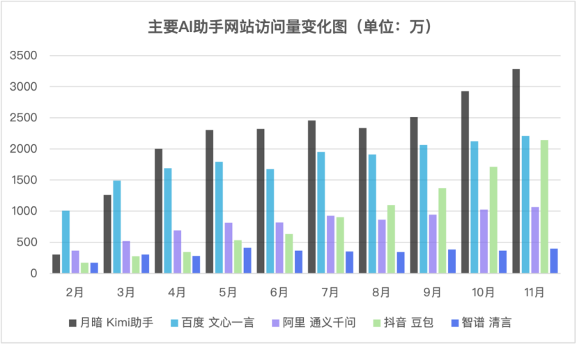 Advertising-driven growth is a classic example of "spending big to achieve miracles." According to AI Product Rankings data, from February to November this year, Kimi's website visits soared from 3.05 million to 32.82 million, while Doubao grew from 1.73 million to 21.43 million.