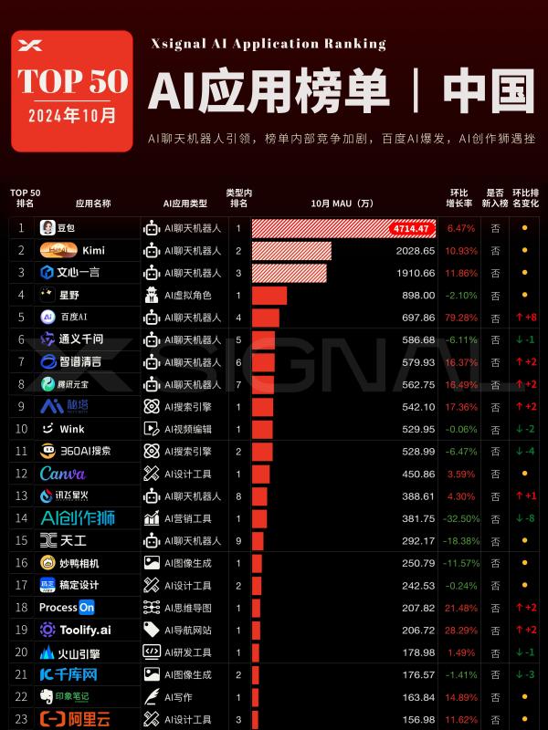 The latest ranking released by Xsignal shows that in October 2024, ERNIE Bot had 19.1066 million daily active users, ranking third, behind Doubao and Kimi apps.
