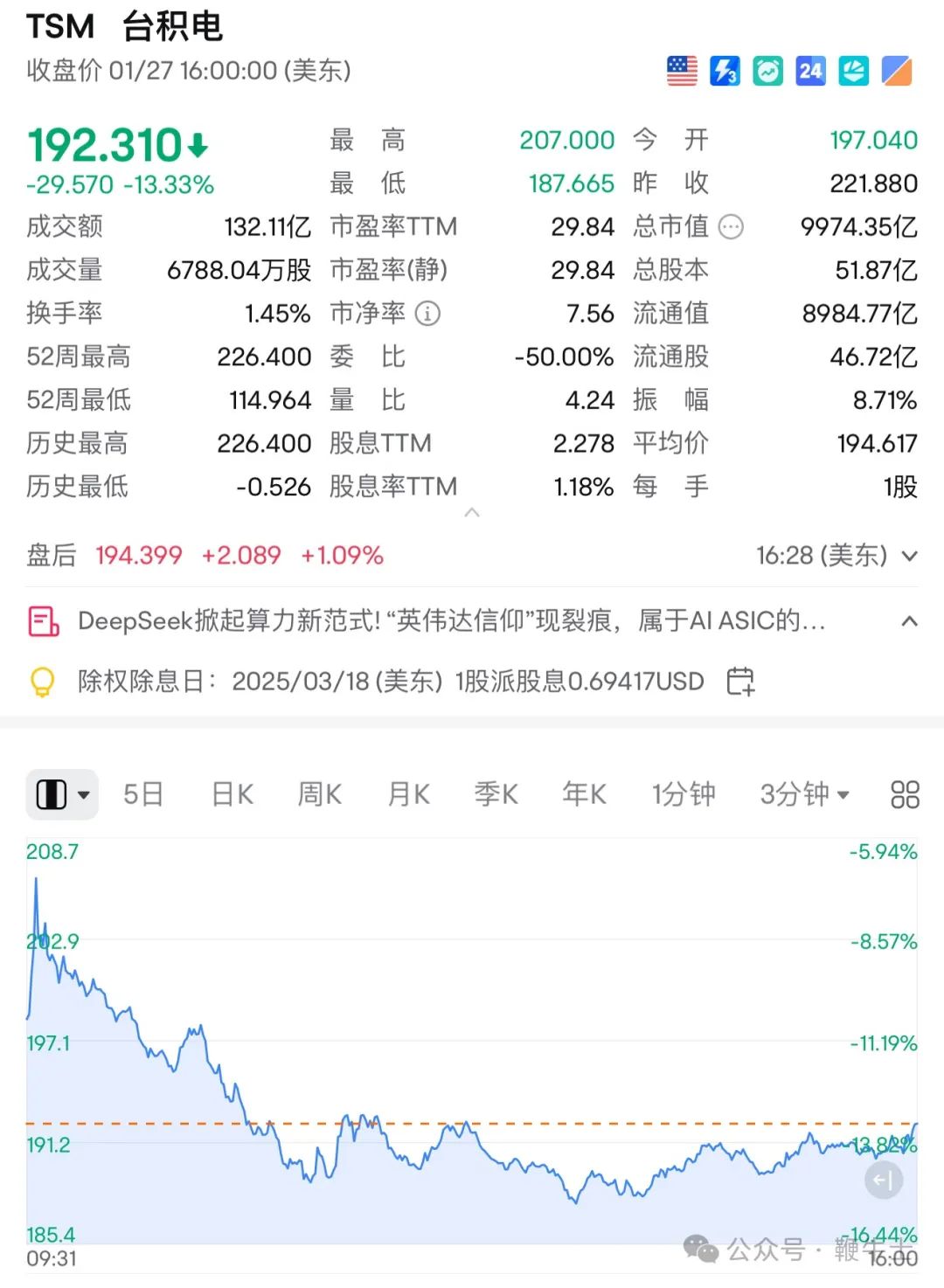 TSMC fell 13%, erasing $150 billion from its market cap, equivalent to approximately $1.1 trillion RMB, and pushing its market cap below the $1 trillion mark. This dragged down the overall stock market, as tech stocks represent a significant portion of the market - Truist analyst Keith Lerner noted that tech stocks account for about 45% of the S&P 500 index. "Ultimately, the U.S.'s exceptional performance is driven by technology and the leading position of U.S. companies in AI," Lerner said. "The launch of the DeepSeek model has made investors question the leading position of U.S. companies, how much they have invested in AI, and whether these investments will yield profits (or overruns)." A series of tech companies will report earnings this week, so their surprising reaction to DeepSeek could lead to market volatility in the coming days and weeks.