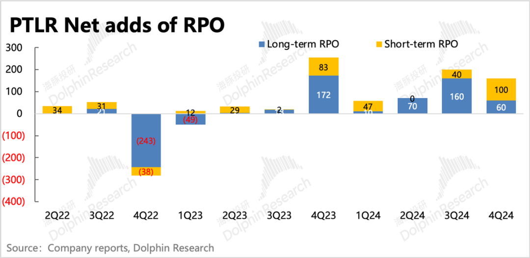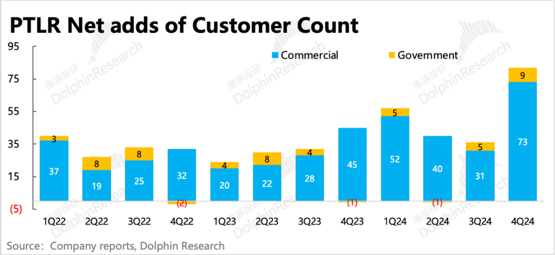 In Q4, Palantir's RPO stood at $1.73 billion, an increase of $160 million from the previous quarter, maintaining a 40% growth rate despite a high base. However, the net increase in long-term contracts in Q4 was lower than that of short-term contracts, indicating a noticeable slowdown compared to the previous quarter. This warrants further observation to ascertain if it was merely due to holiday disruptions. From Dolphin Insights' perspective, increases in long-term contracts are more indicative of genuine growth. Short-term contract increases may stem from the expiration and conversion of long-term contracts rather than reflecting externally driven demand.