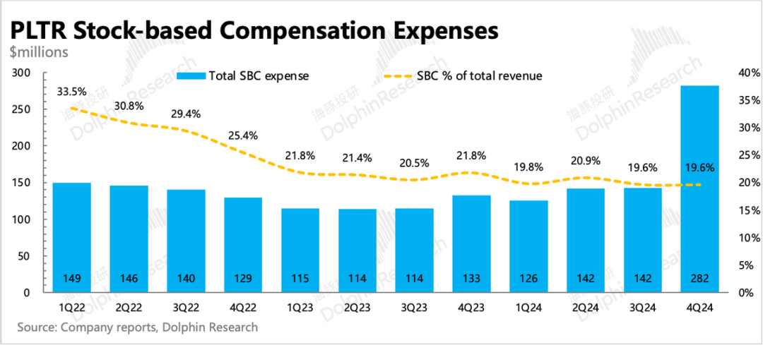4. **Moderate Expense Expansion**: Last quarter, Dolphin Insights predicted that Palantir would start increasing expenses and investments. While some increases were made in Q4, they were overall manageable, particularly compared to revenue expansion. The increase in expenses under GAAP was primarily due to employee share-based compensation (SBC), partly attributed to a doubling of market value. In terms of actual growth in option grants, the workforce scale should have only expanded moderately.