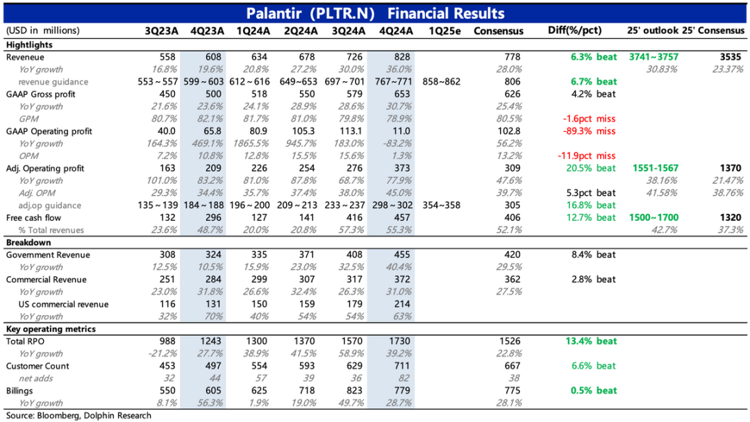 Dolphin Insights' historical research on "Palantir": Financial Report Review on November 5, 2024, "Palantir: AI Faith Ticket Brings New Hope Again"; Financial Report Review on August 6, 2024, "Palantir: Raised Guidance, Confirming the Growth Story of AI"; Financial Report Review on May 7, 2024, "Palantir: Beat Expectations but Plunged? The Market is More Critical Under High Valuation"; Financial Report Review on February 6, 2024, "AI Initiates a New Growth Cycle for Palantir"; Financial Report Review on November 3, 2023, "Palantir: Growth Rebounds Against the Trend, Thanks to AI Again?"; In-depth Analysis on October 13, 2023, "Palantir: What Justifies Its High Valuation?"; In-depth Analysis on September 26, 2023, "Palantir: The 'Mysterious' Military Weapon Activated by AI"