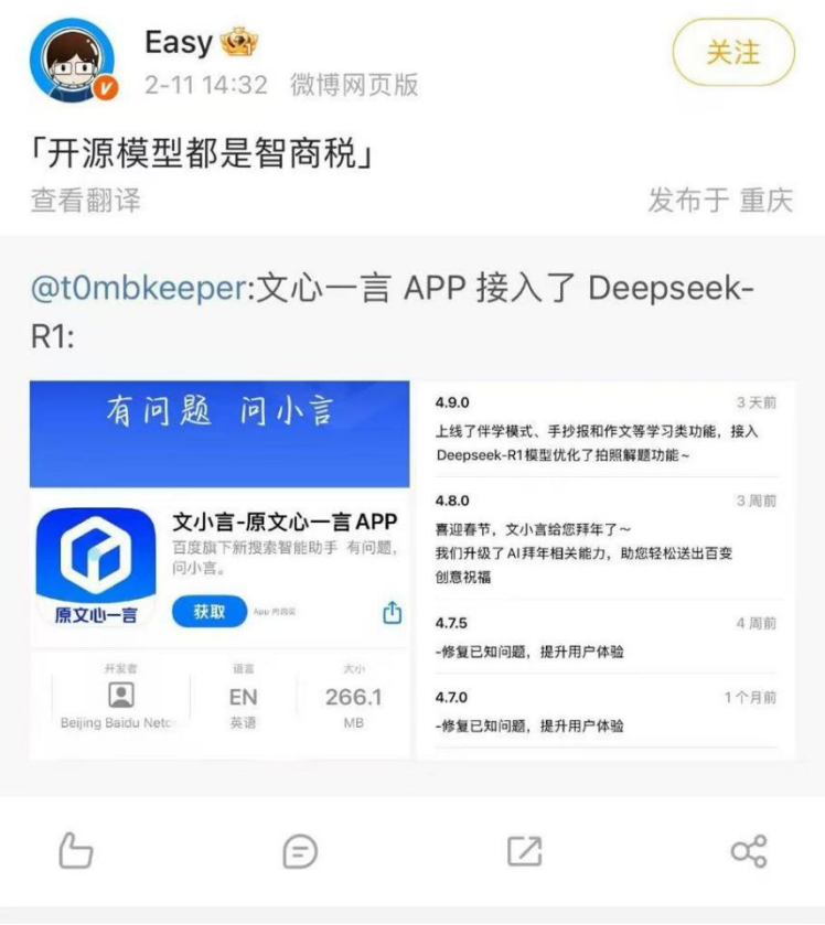 DeepSeek, which promotes two closed-source models, offers this perspective on ERNIE Bot's comeback: