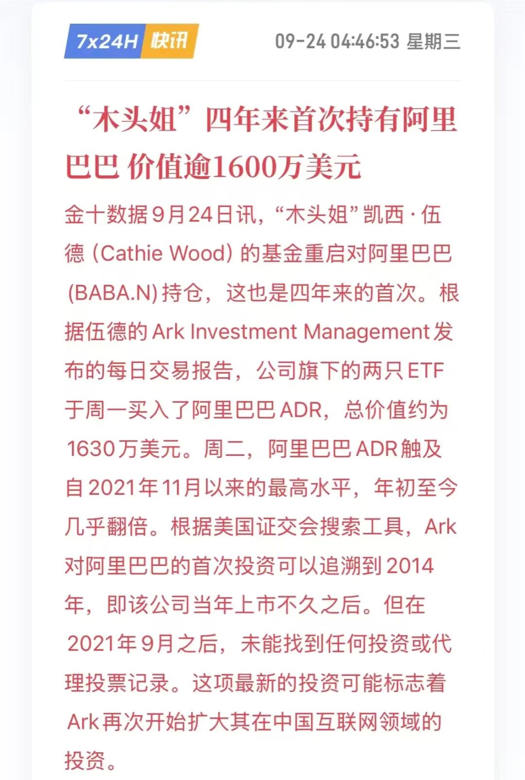There's also news that just before Alibaba's Yunqi Conference kicked off, two ETFs managed by "Wood Sister" (Cathie Wood) bought into Alibaba. This marks the first time in four years that her funds have re-entered Alibaba stocks.