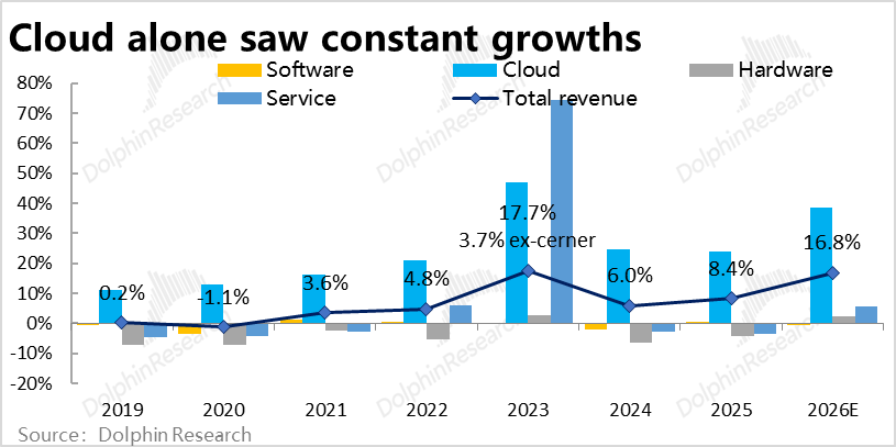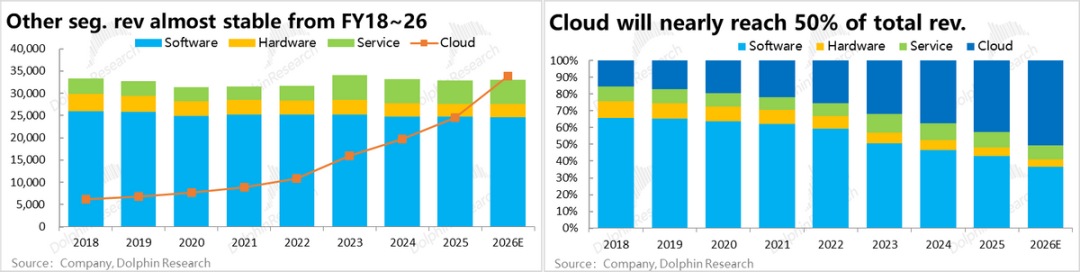 The key change: previously, cloud and software businesses were reported together in the same segment, with some overlap. Now, cloud is separated into a standalone segment—clearly divided into four segments: Cloud, Software, Hardware, and Services—to provide clearer visibility into its cloud business growth.