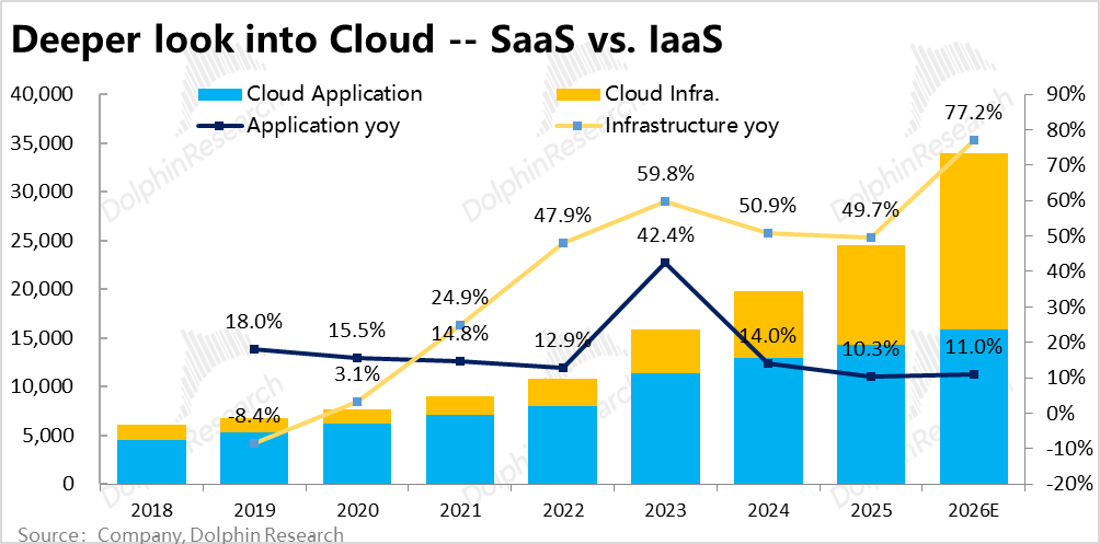 a. Traditional Businesses Lack Luster; OCI Is Not Just 'Icing on the Cake' but a 'Life-or-Death Gamble.' Whether judging from past performance or the company's own guidance, except for the IaaS-based OCI business, all other businesses have entered a mature or even declining phase with little to no growth. (SaaS cloud still has slight growth, while non-cloud businesses have been in negative growth for years.)