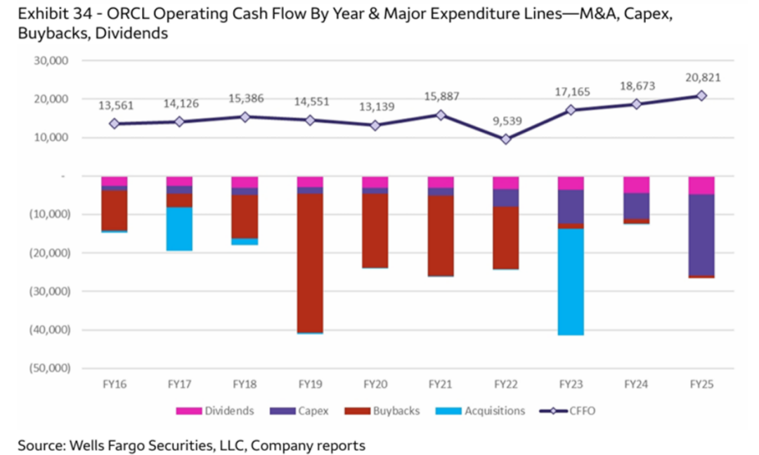 For more than a decade, Oracle has adopted a 'debt-funded operation' philosophy. As seen in the chart below, since FY16, the company's cash expenditures have almost every year exceeded its operating cash flow. In the early years, this was mainly used for massive repurchases and external acquisitions; in the future, it will primarily be used for Capex.